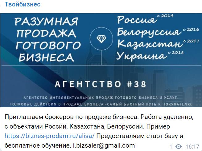 Приглашаем брокеров по продаже бизнеса. Работа удаленно, с объектами России, Казахстана, Белоруссии. Пример https://biznes-prodam.ru/alisa/ Предоставляем старт базу и бесплатное обучение.